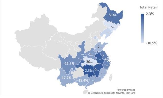 與上月相比,總體零售和服飾零售都有積極的增長,同比分別增長了31.6%和39.5%,零售消費勢頭繼續(xù)保持良好趨勢。