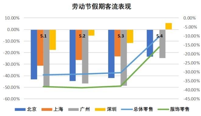 與去年5月相比,總體客流回歸了80%左右,降幅比4月同比收窄了約10個百分點,5月零售市場活力有所增強。
