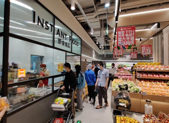 與前三家面積在4000多平米左右,SKU達(dá)7000多,位于商場或社區(qū)內(nèi)的門店相比,9月23日試營業(yè)的T11國奧中心店則是社區(qū)型的臨街門店。在不足1000平的門店里,圍繞當(dāng)?shù)厣倘ι鐓^(qū)居民一日三餐的家庭生活場景而打造的4000多SKU的T11國奧店,簡潔而不簡單。