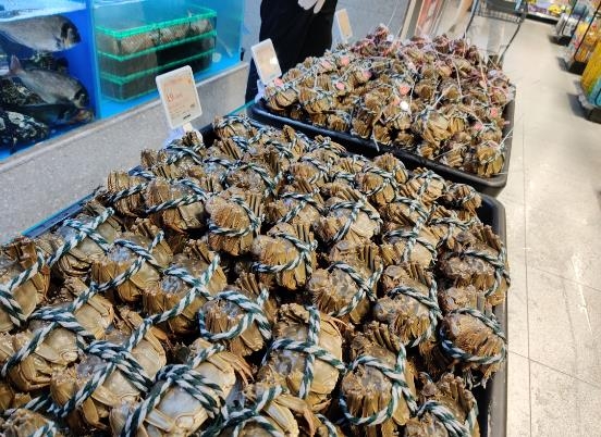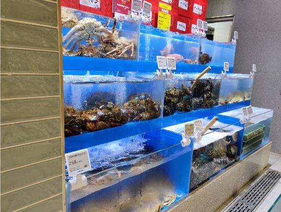 而與很多生鮮mini型門店不同的是,T11國奧店的水產(chǎn)品類則更為齊全,帝王蟹、面包蟹、鮮活黃花魚等生鮮水產(chǎn)也依舊可見。