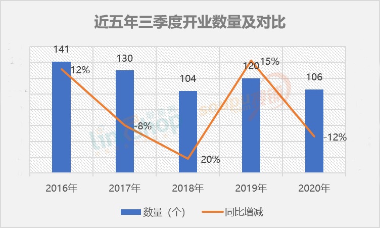 從同比增減度角度看,近五年中有兩年的開業(yè)數(shù)量是同比上增的,且在經(jīng)歷了兩年的同比下跌后,2019年三季度逆勢上漲了15%,2016年三季度的大幅度放量,讓2017和2018兩年的同期比略有下滑,但開業(yè)量同樣保持在百個的水平。2020年同比下滑了12%,屬正常現(xiàn)象,雖然有因疫情耽誤工期而被迫延期開業(yè)的因素,但三季度開業(yè)的項目也有不少是前兩個季度延期下來的。