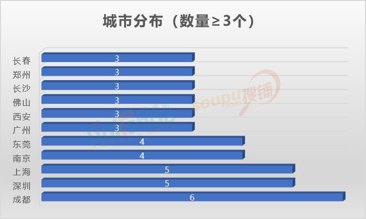 其他諸如重慶、嘉興、寧波、蘇州、濟南、德州、廈門、衡陽、蘭州等城市的開業(yè)量也均在2個及其以上的水平。