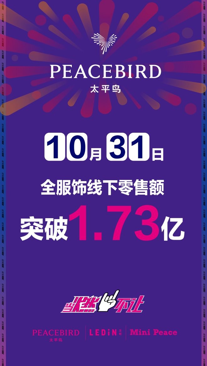 此外,截止31日24時(shí),太平鳥(niǎo)全服飾品牌線下零售額突破1.73億。