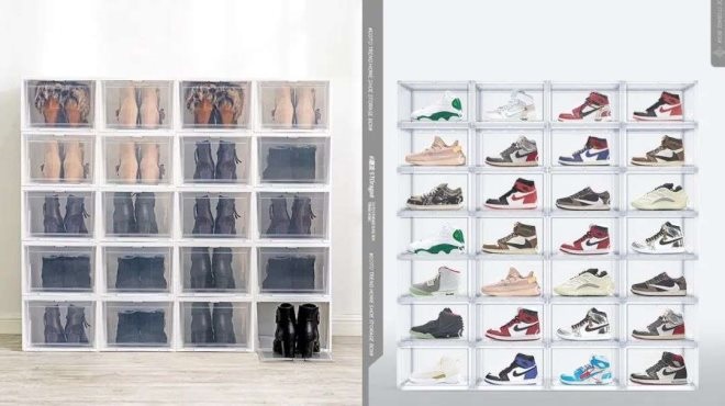 這些打著“高透”、“環(huán)視無障礙”的亞克力鞋盒,堆砌出直男們夢寐以求的鞋墻——與傳統(tǒng)的收納心態(tài)不同,鞋墻要把每一雙鞋都展露出來,用“規(guī)?;毙Ч麧M足自己在收藏中獲得的快樂。