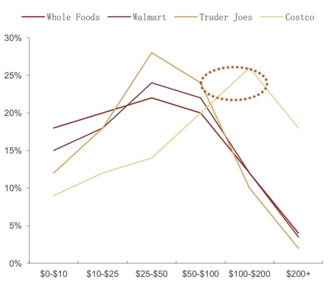Costco目標客群為美國年收入8-10萬美元、Top30%的家庭,在Costco消費的客單價遠高于其他競爭對手。