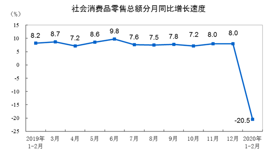 2020年1-2月社會消費品零售總額下降20.5%