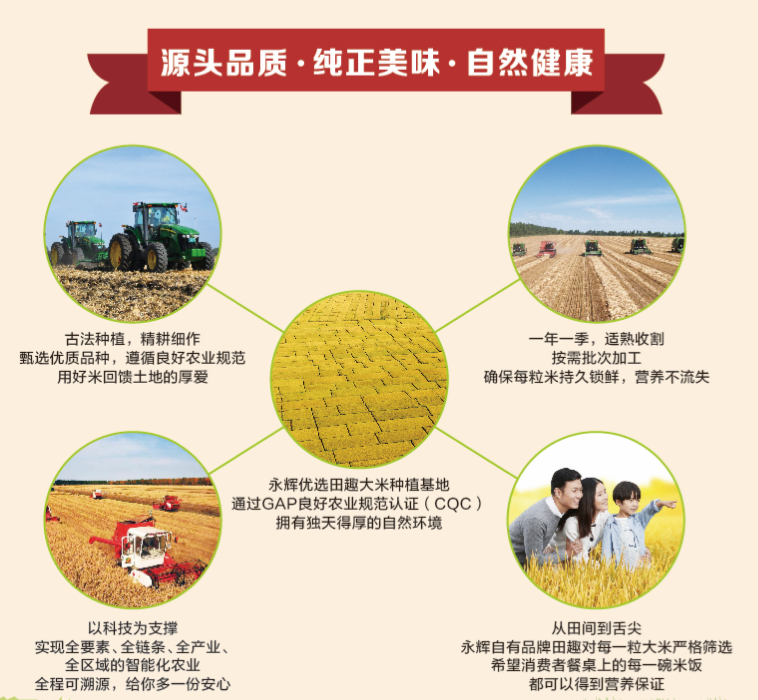為了保障大米的高品質(zhì),田趣圍繞大米消費(fèi)升級(jí),推動(dòng)了品種定制、基地定制、生產(chǎn)定制的供應(yīng)鏈升級(jí)建設(shè)工作。從東北糧倉到魚米江南,精心挑選南北兩大黃金水稻帶,田趣深入產(chǎn)地源頭開發(fā),優(yōu)中選優(yōu),通過真正的訂單農(nóng)業(yè)模式實(shí)現(xiàn)了永輝優(yōu)選田趣大米品質(zhì)的飛躍。