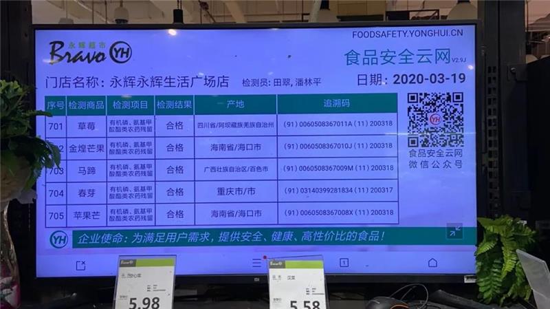 “現(xiàn)在到永輝來買菜,都習慣抬頭看看這塊屏幕,看了這些信息感覺很放心?!睋?jù)了解,截至2019年底,永輝超市已在全國門店啟用了1374塊“食品安全云屏”。通過這些“食品安全云屏”,消費者可以查看當日上架銷售的農(nóng)產(chǎn)品包括檢測商品、檢測項目、檢測結(jié)果、產(chǎn)地、追溯碼等公示信息。