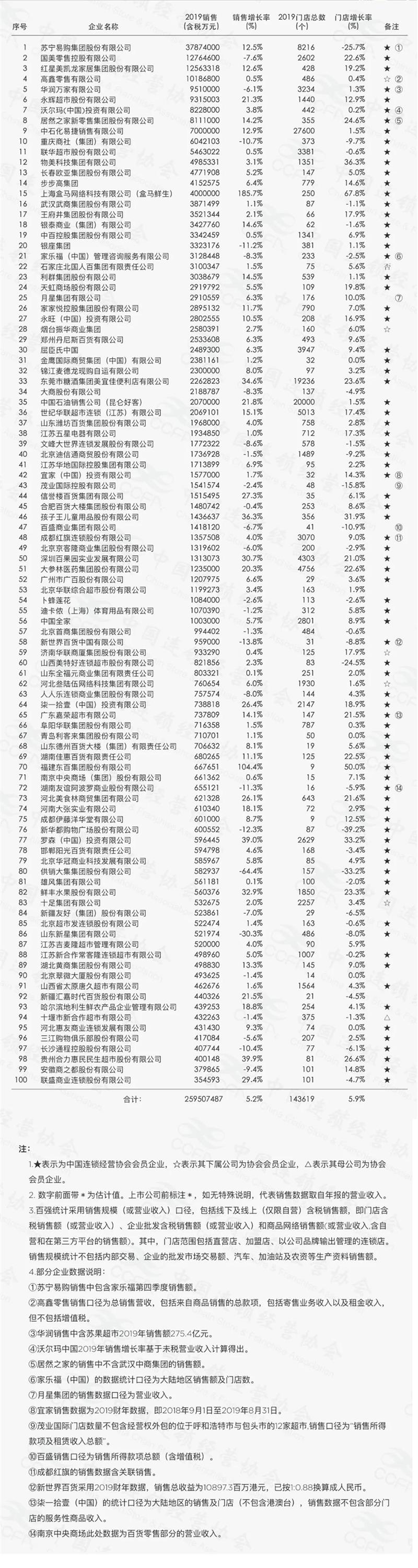 據(jù)百強(qiáng)榜單顯示,2019年連鎖百強(qiáng)銷售規(guī)模近2.6萬億元,同比增長(zhǎng)5.2%,占社會(huì)消費(fèi)品零售總額的6.3%,連鎖百強(qiáng)門店總數(shù)14.4萬個(gè),同比增長(zhǎng)5.9%。百強(qiáng)企業(yè)中銷售實(shí)現(xiàn)正增長(zhǎng)的有73家,比上一年減少5家,增長(zhǎng)率平均為14.4%,其中,永輝超市連續(xù)8年保持銷售和門店兩位數(shù)增長(zhǎng),銷售同比增長(zhǎng)21.3%,超出平均增長(zhǎng)率6.9個(gè)百分點(diǎn),為前十強(qiáng)企業(yè)中銷售增速最高的企業(yè)。