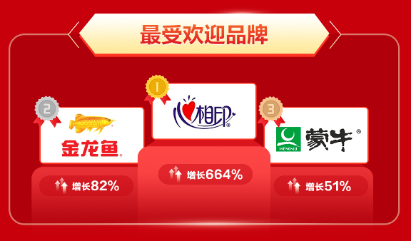 戰(zhàn)報(bào)顯示,心相印、金龍魚及蒙牛成為本次最受消費(fèi)者喜愛的品牌。其中心相印銷售額增長達(dá)664%。