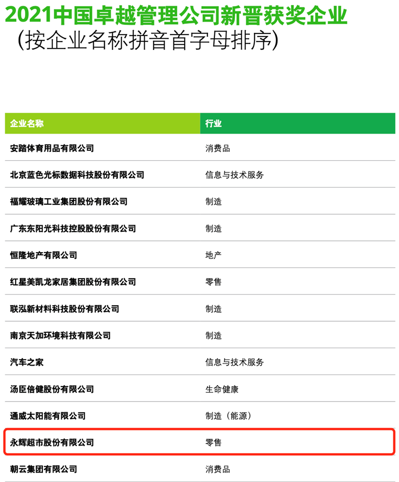 “中國卓越管理公司 ”(Best Managed Companies,下稱BMC) 項目是目前中國市場上唯一針對民營企業(yè)管理體系進行全面考評的評選項目,入選該獎項也是對永輝超市二十余年穩(wěn)健發(fā)展的充分肯定。作為全國零售業(yè)龍頭企業(yè),永輝自創(chuàng)立以來始終堅持民生超市初心,致力為用戶提供安全、健康、高性價比的生鮮及產(chǎn)品,得到了眾多消費者的認可,截止目前永輝超市已在全國發(fā)展超千家連鎖超市,業(yè)務覆蓋29個省份,584個城市,位居2020年中國連鎖百強第四。