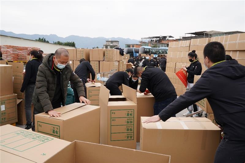 為保證支援物資盡快到位,永輝各方聯(lián)動,十余小時完成90萬件物資的調(diào)配并運抵永輝物流南嶼基地。90萬件物資,9000平方米空地,數(shù)十條生產(chǎn)線,近千名永輝人,爭分奪秒、連續(xù)奮戰(zhàn)27小時,終于完成了10萬份商品的拆包、分裝、打包工作。