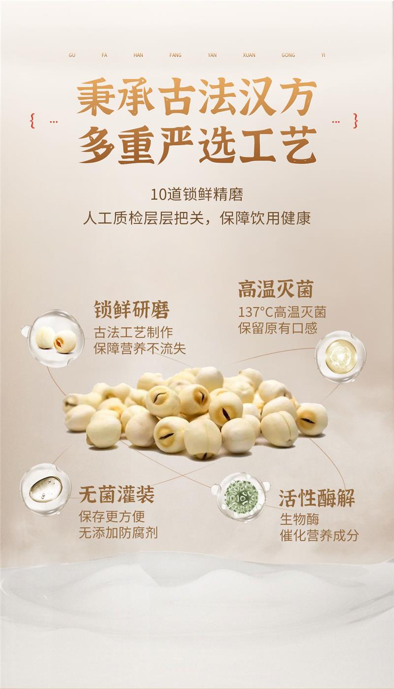 在制作工藝方面,饞大獅蓮子汁采用鎖鮮研磨工藝,用生物酶對(duì)其進(jìn)行活性酶解,既能保證蓮子營(yíng)養(yǎng)不流失,又能催化其中的營(yíng)養(yǎng)成分。再經(jīng)過(guò)137°高溫滅菌、無(wú)菌灌裝等處理流程,保留了蓮子原有的清甜口感。