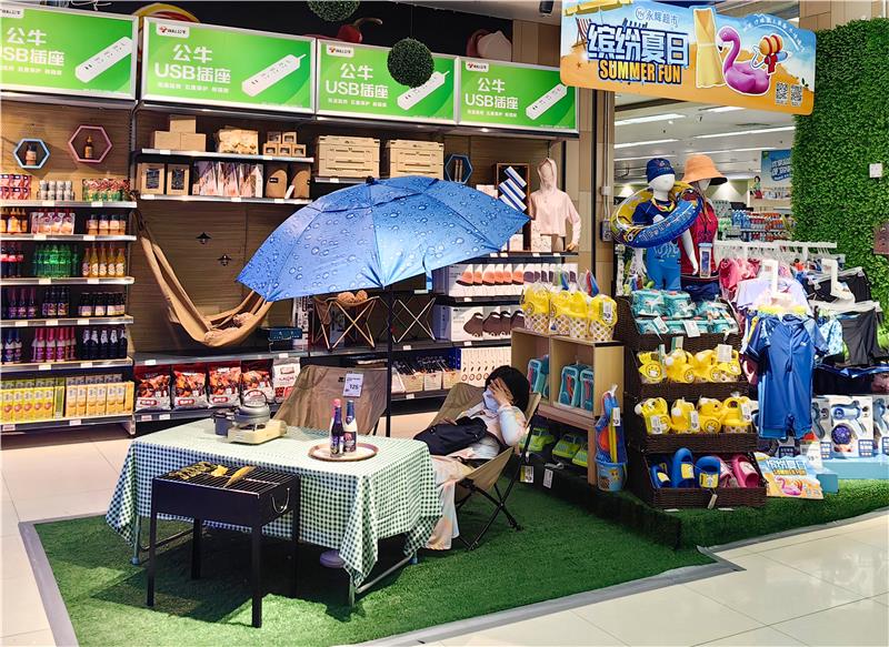 除此之外,永輝也在多家門店內增加了場景式的主題布置,即根據季節(jié)、節(jié)慶、消費場景的不同,在店內公共區(qū)域設置主題并集中展示關聯(lián)產品。如懸掛了多個游泳圈的歡樂水上用品陳列區(qū)、布置了野餐墊和躺椅的戶外用品陳列區(qū)、集合了牙膏、牙刷、漱口水、牙線棒等關聯(lián)產品的口腔健康陳列區(qū)等,滿足消費者在某一場景下的一站式購物需求。