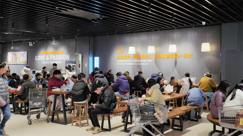 “我以前就是這家超市的??停瑳]想到調(diào)改后變化這么大?,F(xiàn)在熟食產(chǎn)品種類很多,不想做飯來這邊買點(diǎn)現(xiàn)成的,買完單在顧客休息區(qū)就可以用餐,方便了很多?!眲倓傁掳嗟膹埮恳贿吿暨x商品一邊說。而永輝超市新增的顧客休息區(qū)坐滿了用餐和休息的顧客,休息區(qū)里洗手池、濕紙巾、直飲水、一次性水杯、血壓計(jì)、身高體重測(cè)量?jī)x等便民設(shè)施一應(yīng)俱全,除了用餐的顧客,也有不少顧客在休息區(qū)量身高體重、測(cè)血壓。