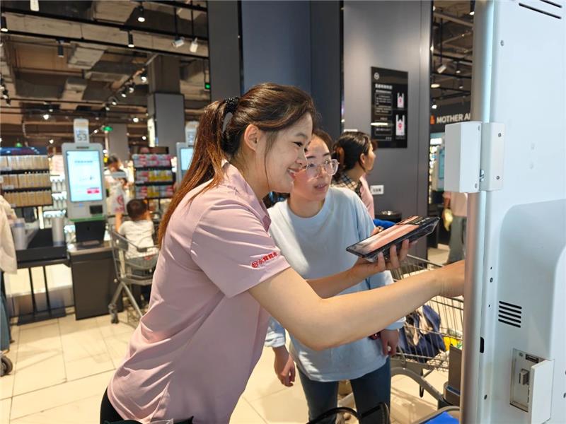 在北京鴻坤廣場(chǎng)店客流高峰時(shí)段,收銀支援員工王麗正嫻熟地疏導(dǎo)著排隊(duì)人群。“您好,這邊可以結(jié)賬,請(qǐng)跟我來!”她面帶微笑,用清晰有力的指引聲,將推著滿載購(gòu)物車的顧客分流至不同收銀通道。面對(duì)持續(xù)涌入的顧客,王麗始終保持著專業(yè)的工作節(jié)奏,一邊快速判斷各通道結(jié)賬進(jìn)度,一邊及時(shí)補(bǔ)位支援。這看似重復(fù)的引導(dǎo)工作,實(shí)則是保障顧客購(gòu)物體驗(yàn)的關(guān)鍵環(huán)節(jié)——正是這些基層員工日復(fù)一日的專業(yè)服務(wù),構(gòu)筑起超市高效運(yùn)轉(zhuǎn)的服務(wù)基石。