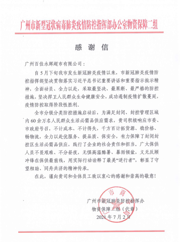近日,廣州百佳永輝超市收到來自廣州市新冠肺炎防控指揮辦物資保障組的感謝信,信中對永輝在疫情期間為保供保價(jià)格所做的努力表示感謝。 ...