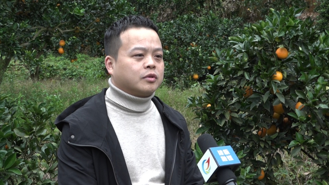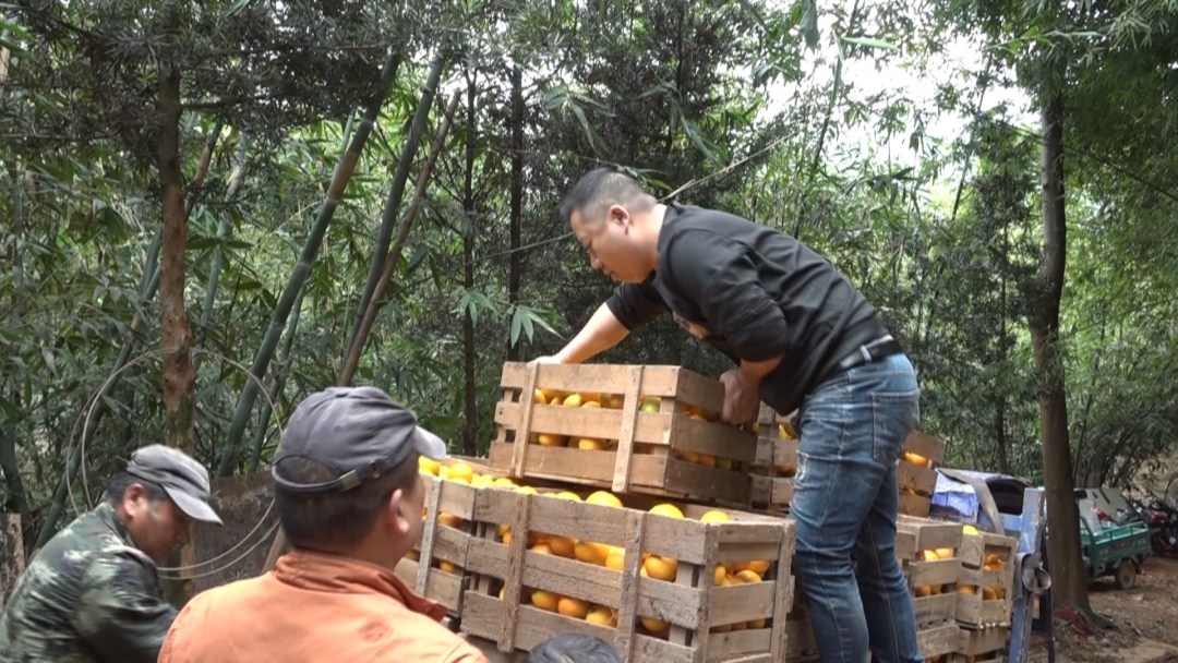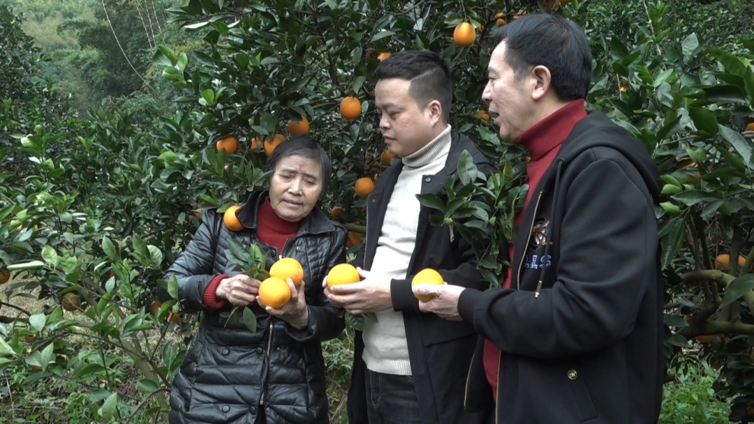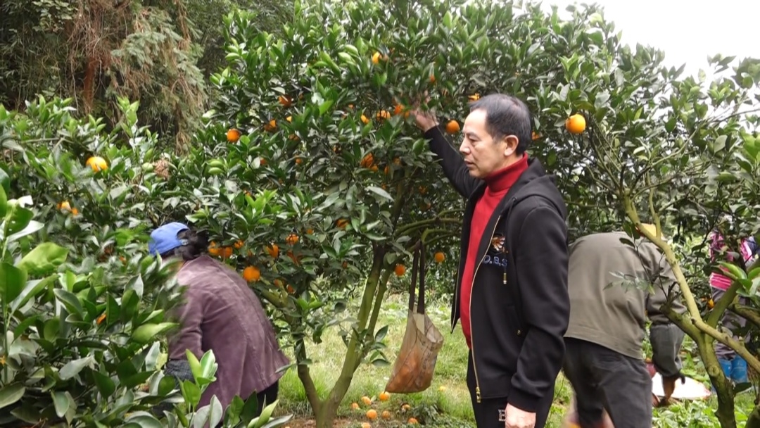 果園里橙香四溢,黃澄澄的臍橙掛滿枝頭,工人們嫻熟的將臍橙摘下。果樹下,幫助朱招弟與永輝牽線搭橋的愛心人士游厚壽也來看望朱招弟一家。
